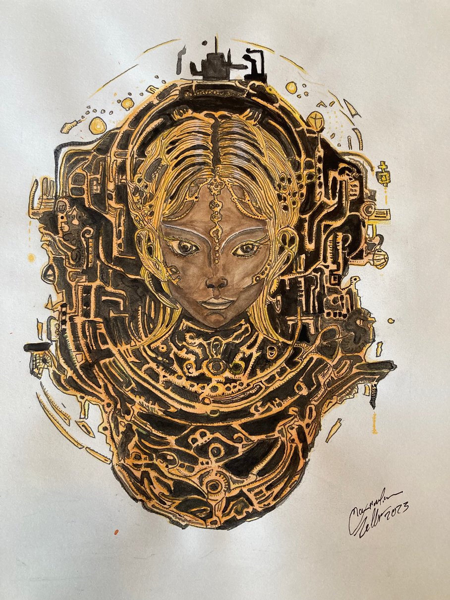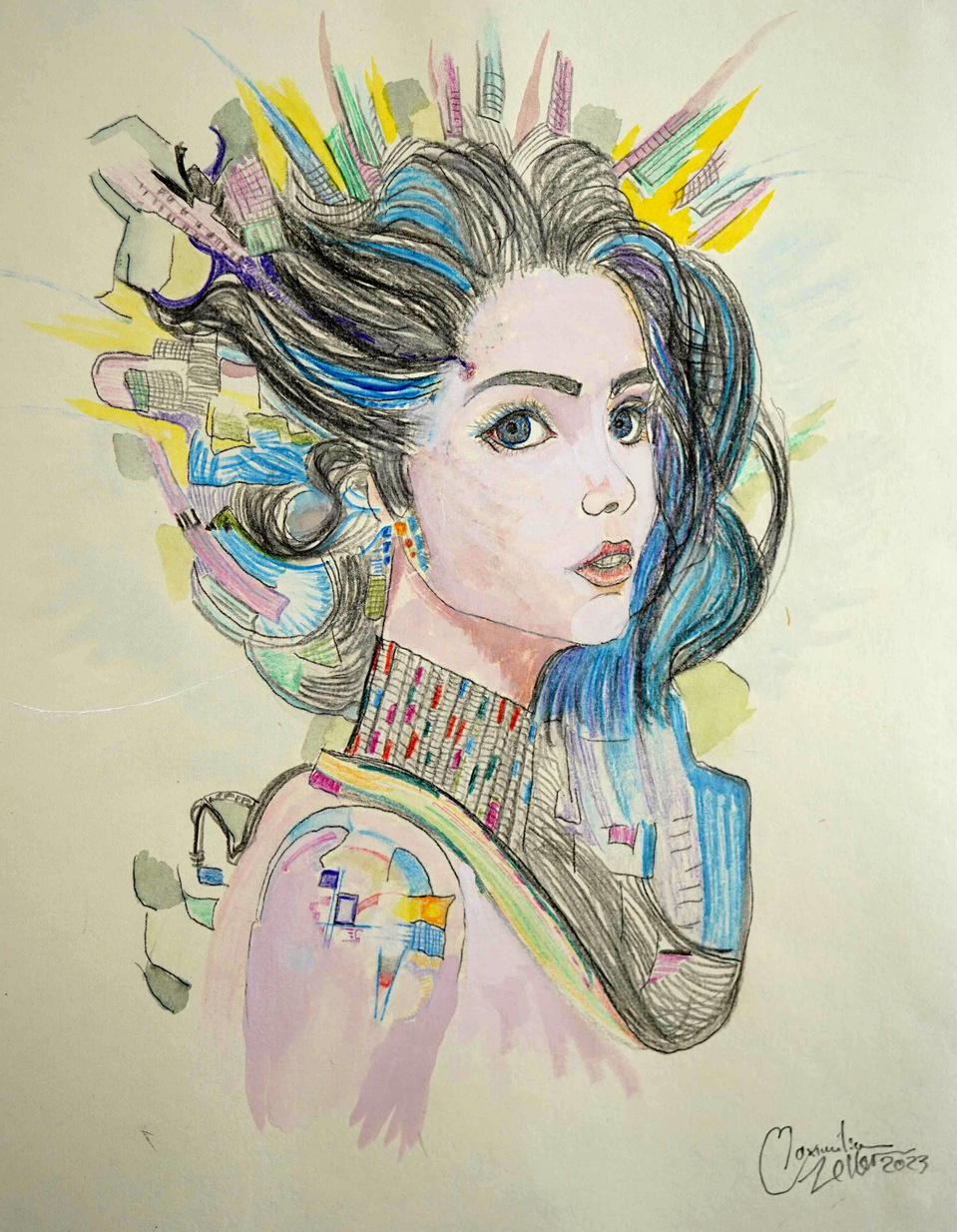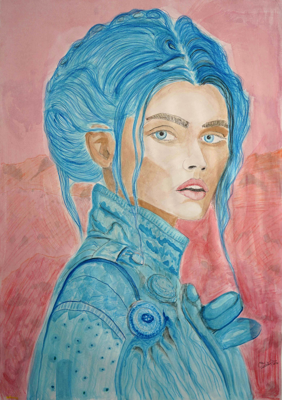 Using Oilcolor,Pastell, Graphite, Acryl, Aquarell, Gold, Silver, Stone, Charcoal, Sanguine, Photoshop Affinity, Ink, Color Pencils, Markers, and everything that can bring interesting colors and forms.