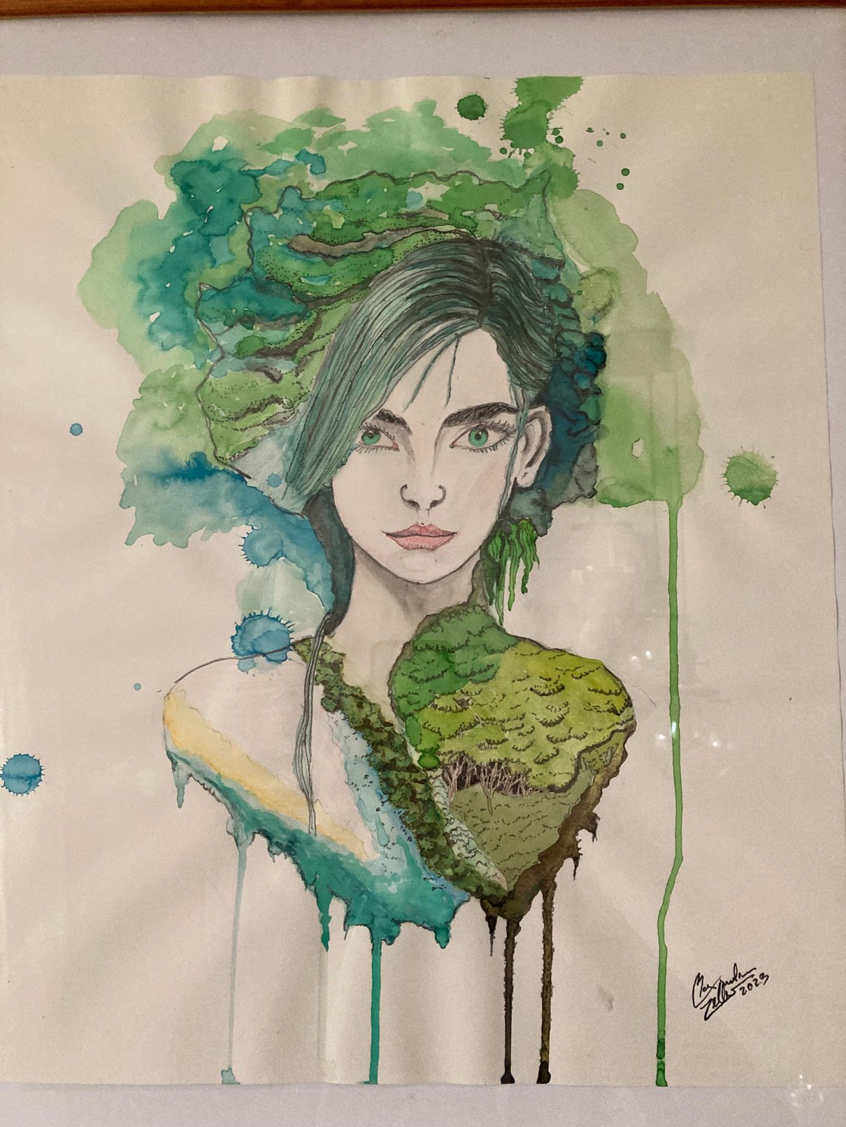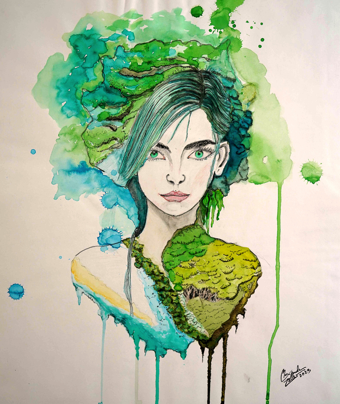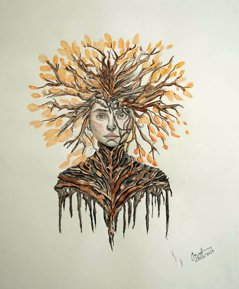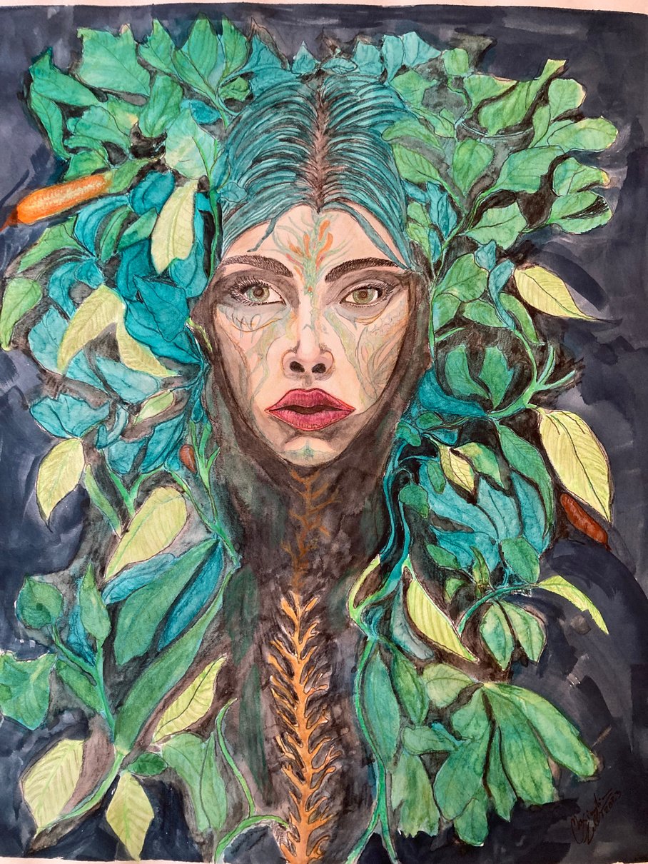 The woman, embodying a forest and a beach, nature at her heart.